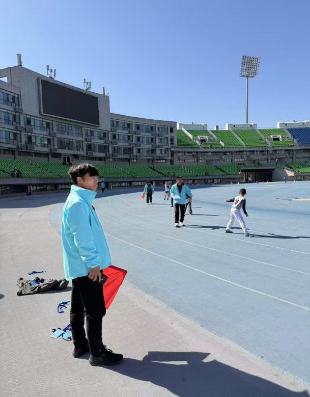 在赛场上,景德镇学院的师生们身着统一服装,以严谨的态度完成了径赛、田赛等项目的裁判任务,展现了体育专业学子的实操能力与责任意识。现场合影中,师生们手持学院旗帜,也成为赛事保障队伍里的一抹亮色。