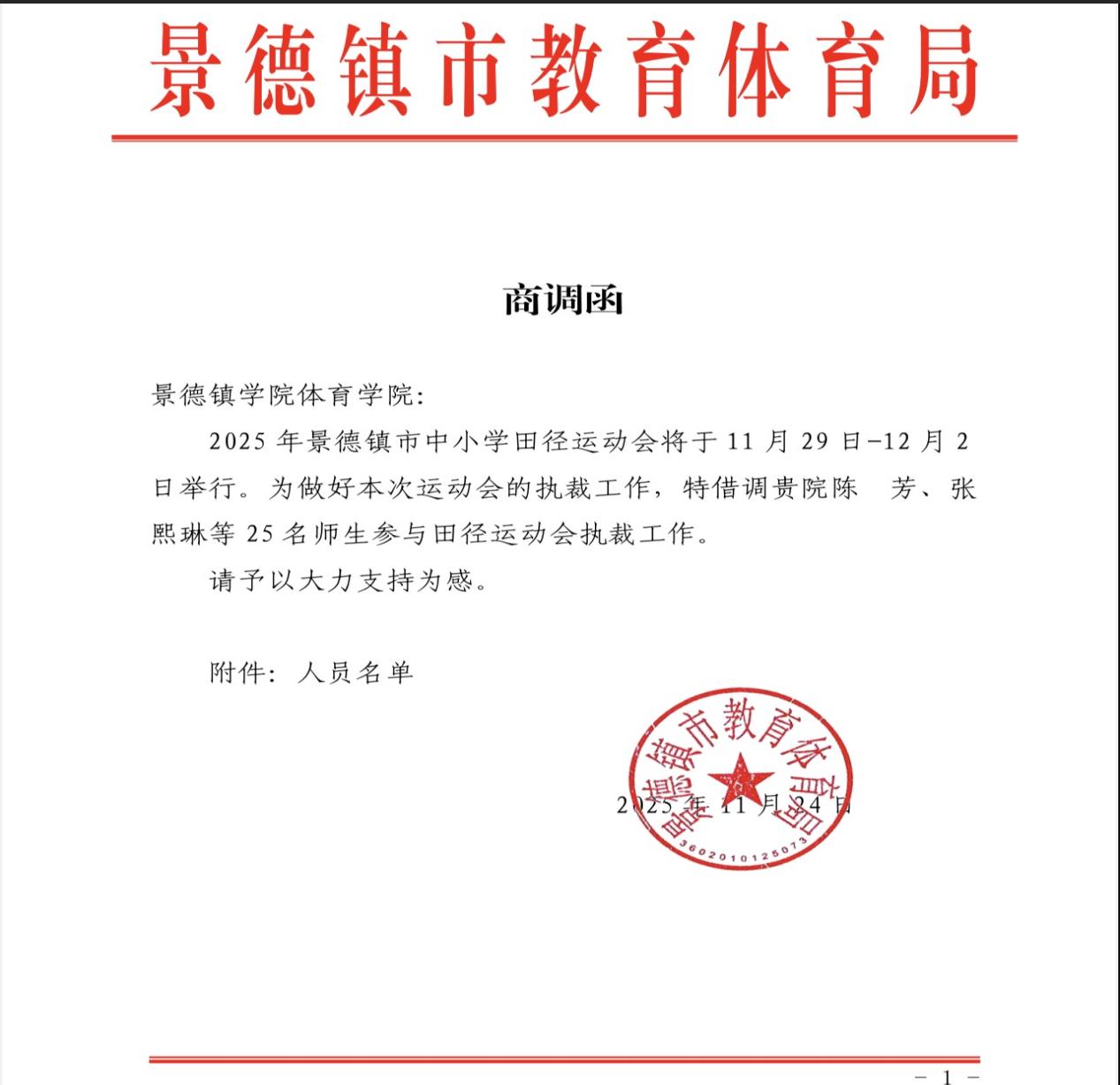 景德镇市教育体育局向景德镇学院体育学院发出商调函,借调陈芳、张熙琳等25名师生参与11月29日-12月1日的运动会执裁工作。接到通知后,学院迅速协调,组织师生提前熟悉赛事规则、明确执裁分工。
