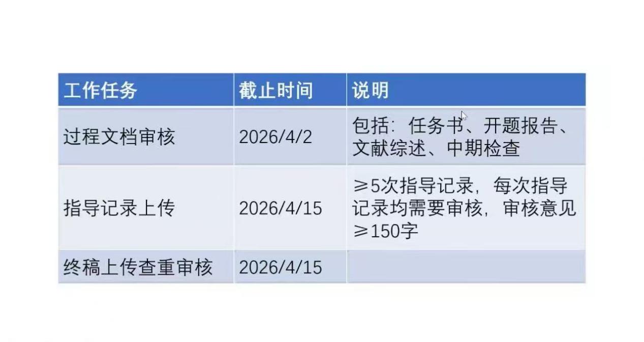 随后,会议详细部署了论文工作各阶段的任务安排与时间节点。4月2日将启动过程文档审核工作,审核范围涵盖毕业论文任务书、开题报告、文献综述及中期检查材料,要求指导教师严格把关,确保学生前期研究准备充分。4月15日为两项关键任务的截止节点:一是指导记录上传,需完成不少于5次指导记录,且每次记录均需通过审核,审核意见字数不得少于150字,以保障指导过程的规范性与实效性;二是终稿上传与查重审核,学院将统一组织论文查重,严格控制重复率标准,杜绝学术不端行为。